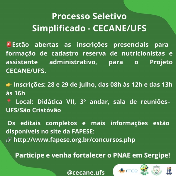 Início /Notícias/Cecane UFS divulga processo seletivo simplificado. Notícias Participe do processo seletivo e fortaleça o PNAE em Sergipe!!! Cecane UFS divulga processo seletivo simplificado. Oportunidade imperdível!!!